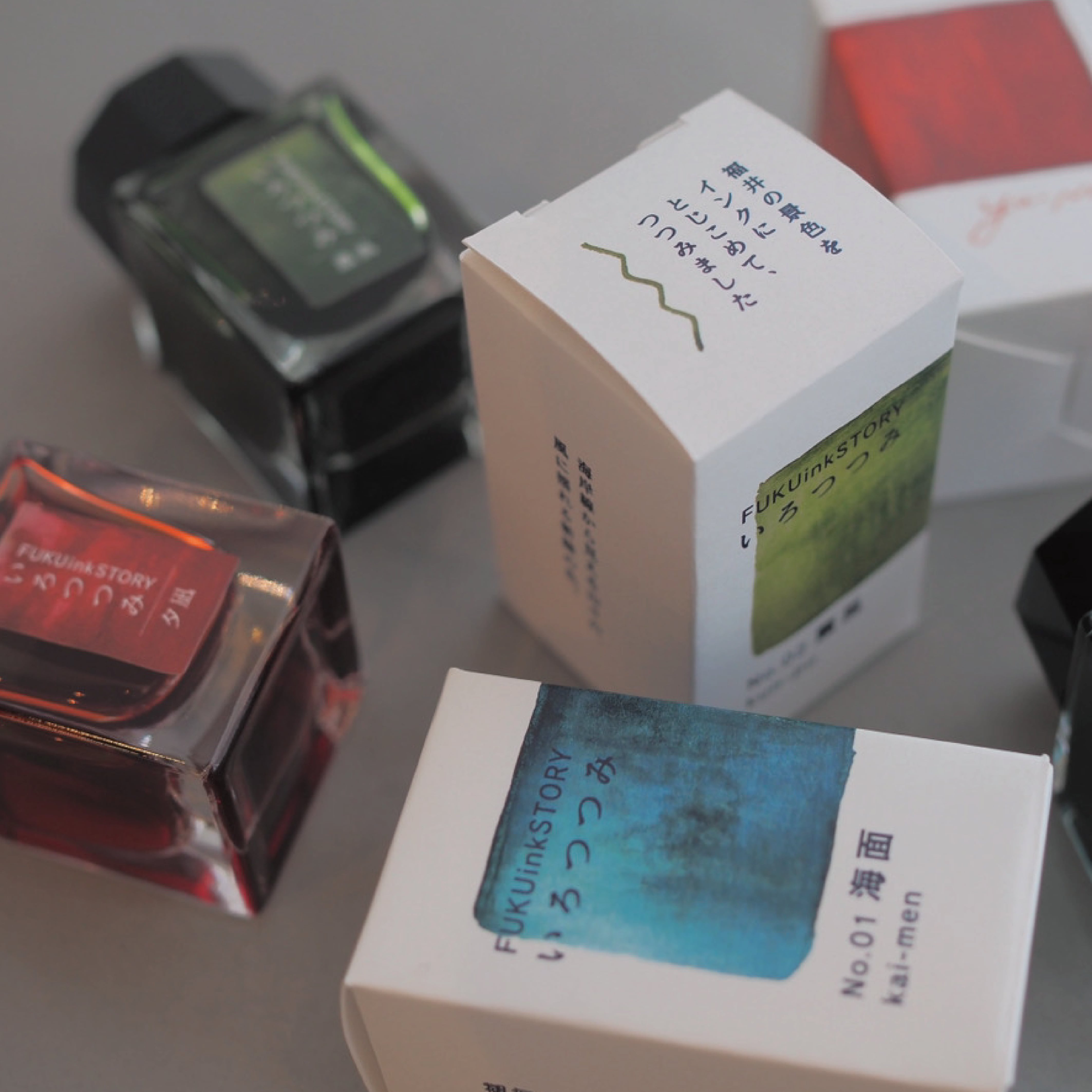 FUKUink STORY「いろつつみ」は、2025年春に開催した「⽂具HORI博」でお客様から寄せられた「福井で好きな⾵景」の声をもとに誕生したオリジナルインクです。